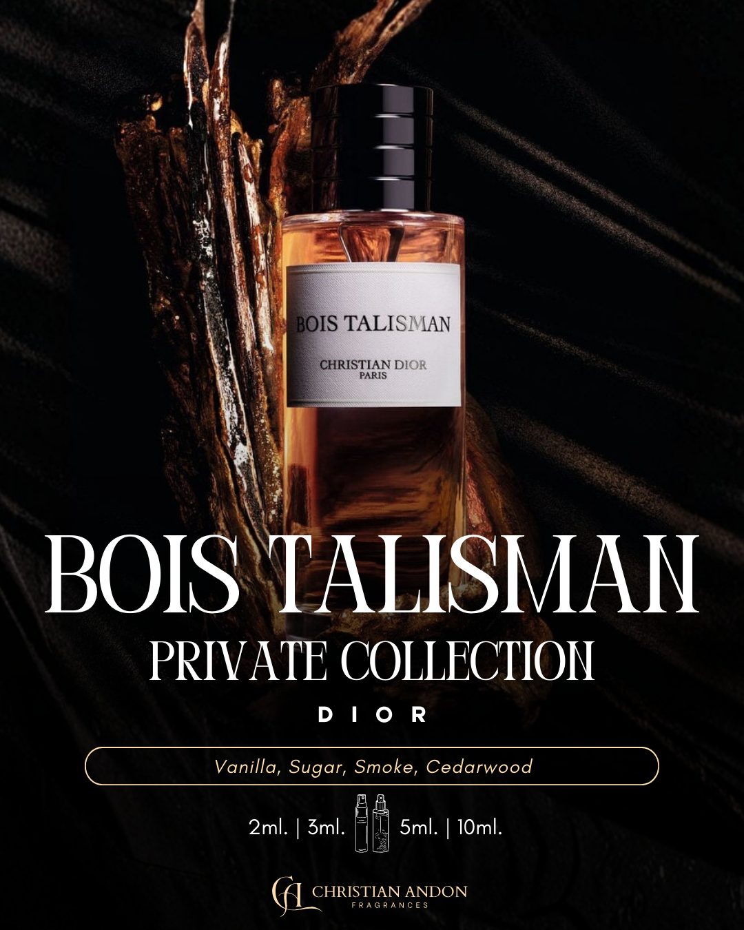 Bois Talisman обединява тези две поверия в една мистична ароматна композиция. Дървесен и ванилов, ароматът е създаден като модерен амулет – с топла основа от кедрово дърво, върху която се разгръща трио от изискани ванилови акорди. Мощен, фин и многопластов, той носи усещане за защита, стил и вътрешна сила.